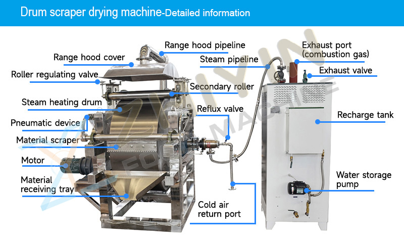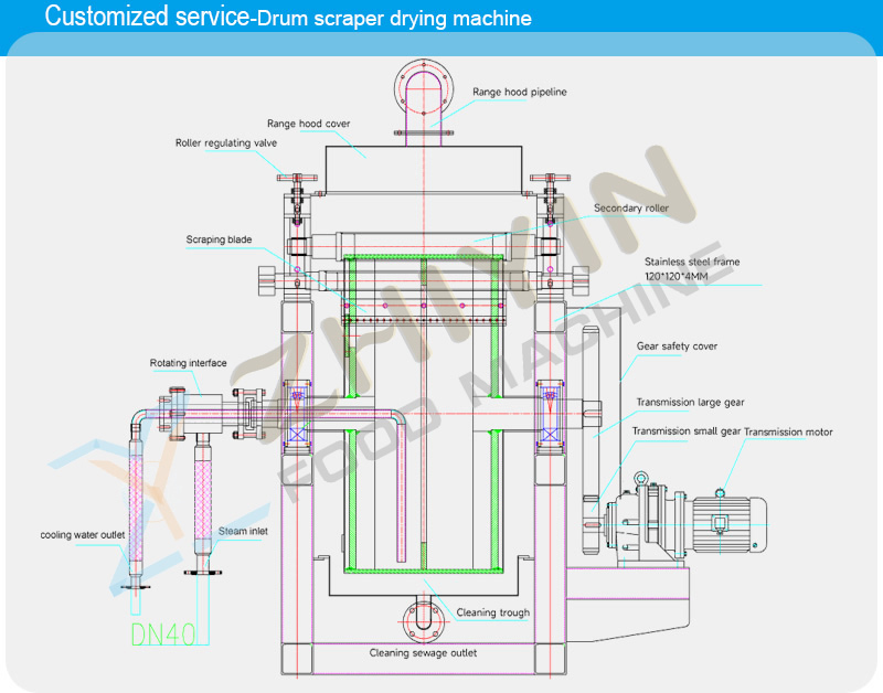 The drum scraper dryer is suitable for drying liquid and viscous materials in industries such as chemical, dye, food, metallurgy, yeast, etc, And the dried products of Rice noodles, oatmeal, a starch, potato powder and other foods into flakes, powders and granules.